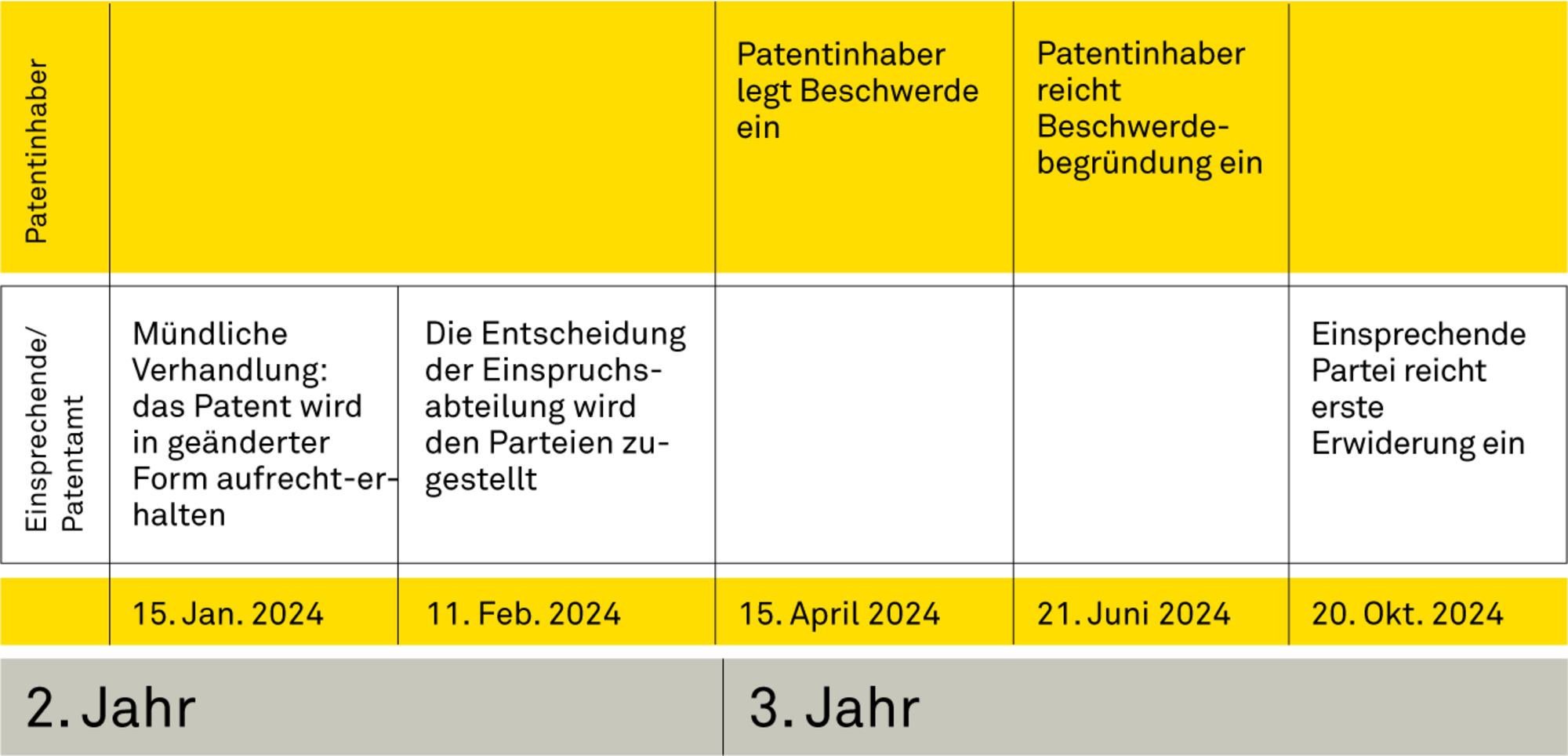 Das erstinstanzliche Einspruchsverfahren unterliegt seit dem 1. Juli 2016 einem strengen Fristenrahmen. Nach Ablauf der Einspruchsfrist wird dem Patentinhaber eine viermonatige Frist zur Erwiderung auf den oder die Einsprüche gesetzt. Fristverlängerungen werden nur in Ausnahmen gewährt. Wenn die Einspruchsabteilung dies für erforderlich hält, fordert sie die Beteiligten danach gegebenen-falls auf, sich innerhalb gesetzter Fristen weiter zu äußern.